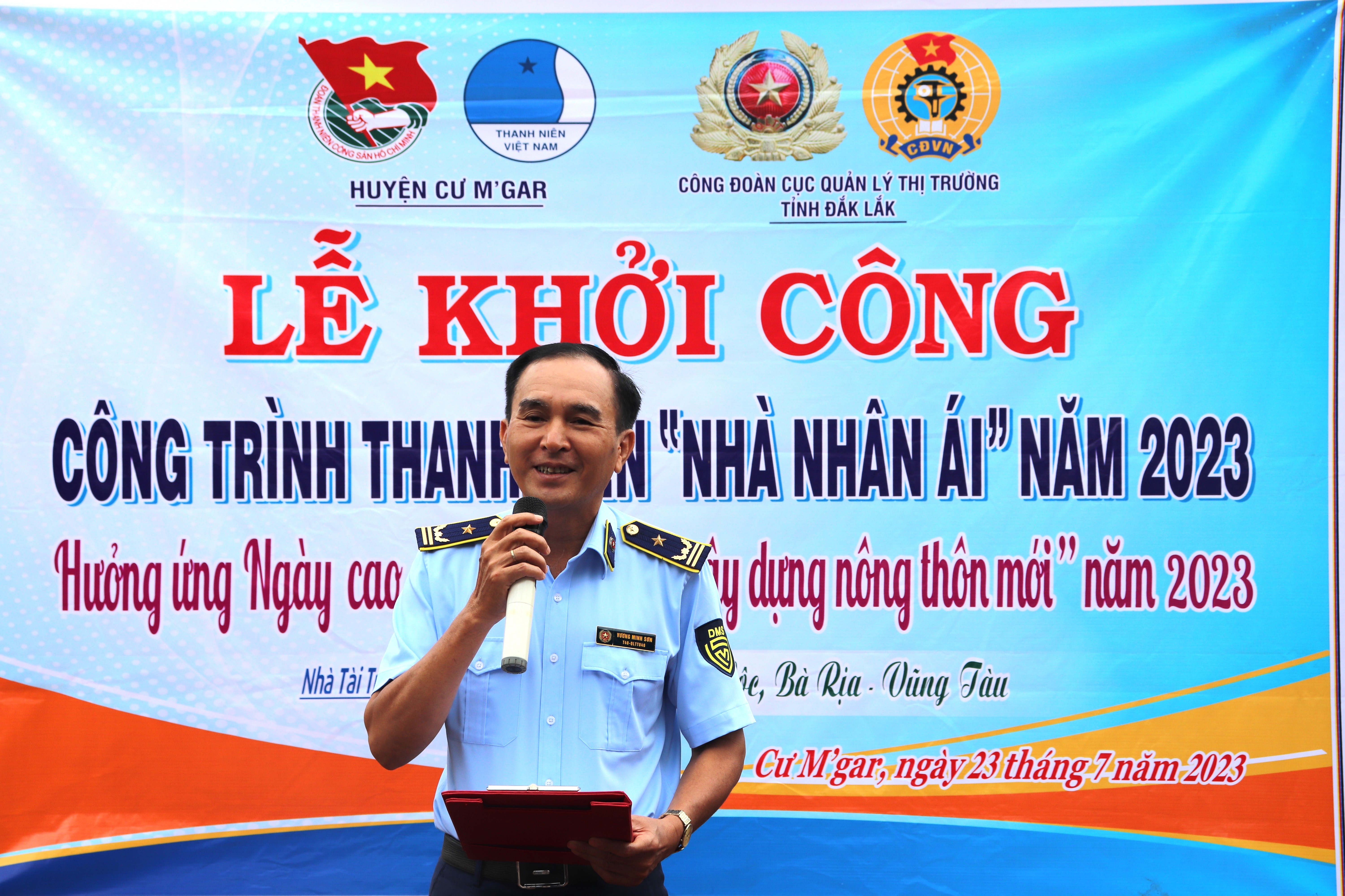 Phát biểu tại buổi lễ, đồng chí Vương Minh Sơn - Đảng ủy viên, Phó Cục trưởng Cục Quản lý thị trường tỉnh Đắk Lắk cho biết: “Thay mặt Đảng ủy, lãnh đạo và các tổ chức đoàn thể Cục Quản lý thị trường, tôi xin được trân trọng cảm ơn các cấp chính quyền huyện Cư M’gar và nhà tài trợ chính của Chương trình - anh Nguyễn Phước Lộc đã tạo điều kiện để chúng tôi được chung tay thực hiện hoạt động ý nghĩa này. Hi vọng rằng, công tác xây dựng Nhà nhân ái sẽ được thực hiện thuận lợi, bàn giao đúng tiến độ, giúp hộ gia đình anh Y Yok Hwing vơi bớt khó khăn, có nơi ở ổn định, chuyên tâm phát triển kinh tế gia đình.”.