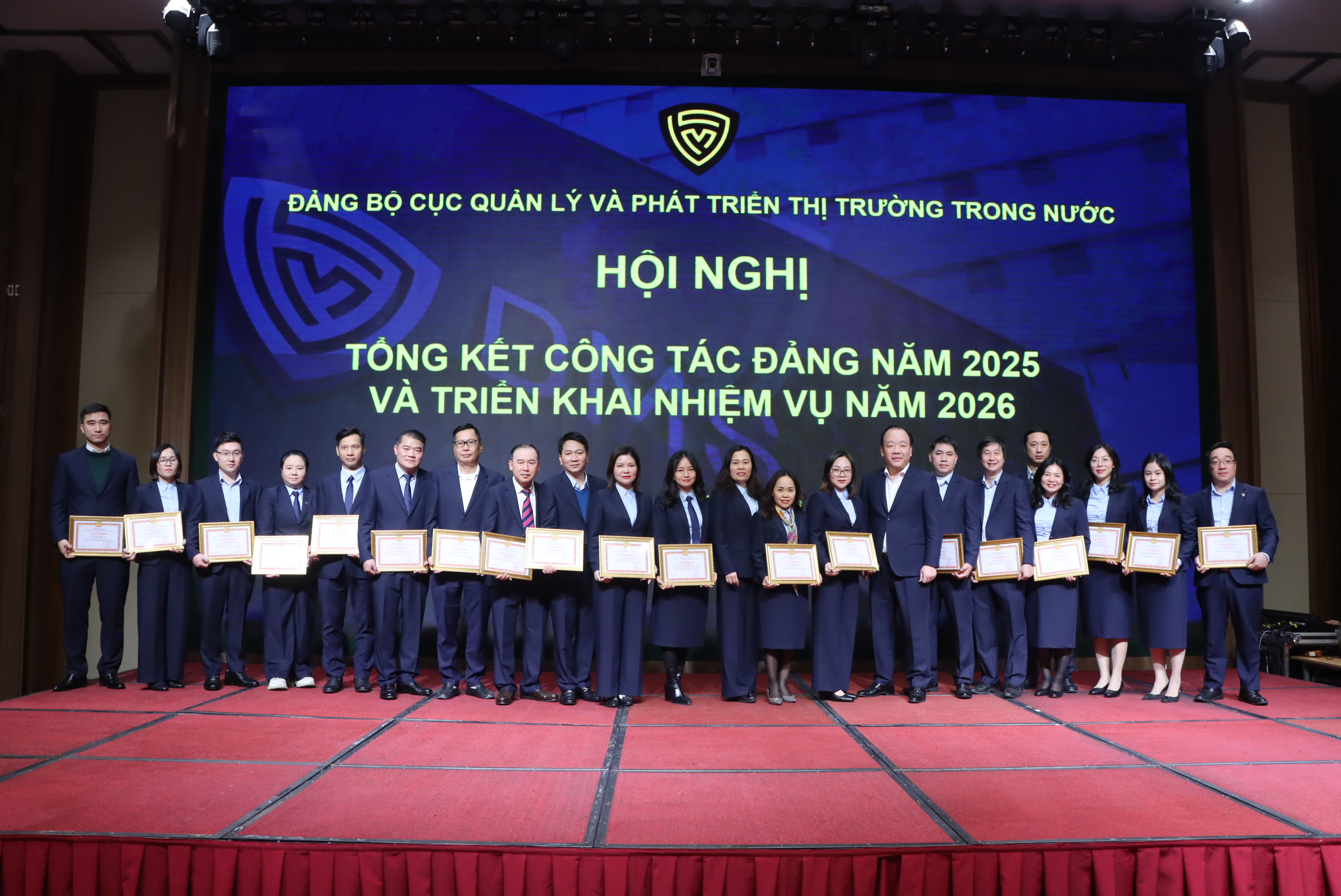 Tại Hội nghị, Đảng Bộ Cục Quản lý và Phát triển thị trường trong nước đã trao tặng Giấy khen cho 2 Chi bộ và 20 đảng viên đạt thành tích hoàn thành xuất sắc nhiệm vụ năm 2025..