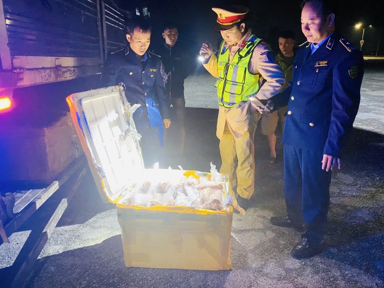 Trong quá trình khám phương tiện, lực lượng chức năng phát hiện trong khoang chứa hàng hóa có 04 thùng xốp, bên trong chứa chân giò đông lạnh (rút xương), với tổng trọng lượng hơn 200kg, trị giá hàng hóa trên 17 triệu đồng. Toàn bộ số hàng hóa không có nhãn hàng hóa, không có hóa đơn, chứng từ chứng minh nguồn gốc hợp pháp của hàng hóa, đang trong giai đoạn phân hủy và bốc mùi hôi thối, không bảo đảm điều kiện an toàn thực phẩm.
