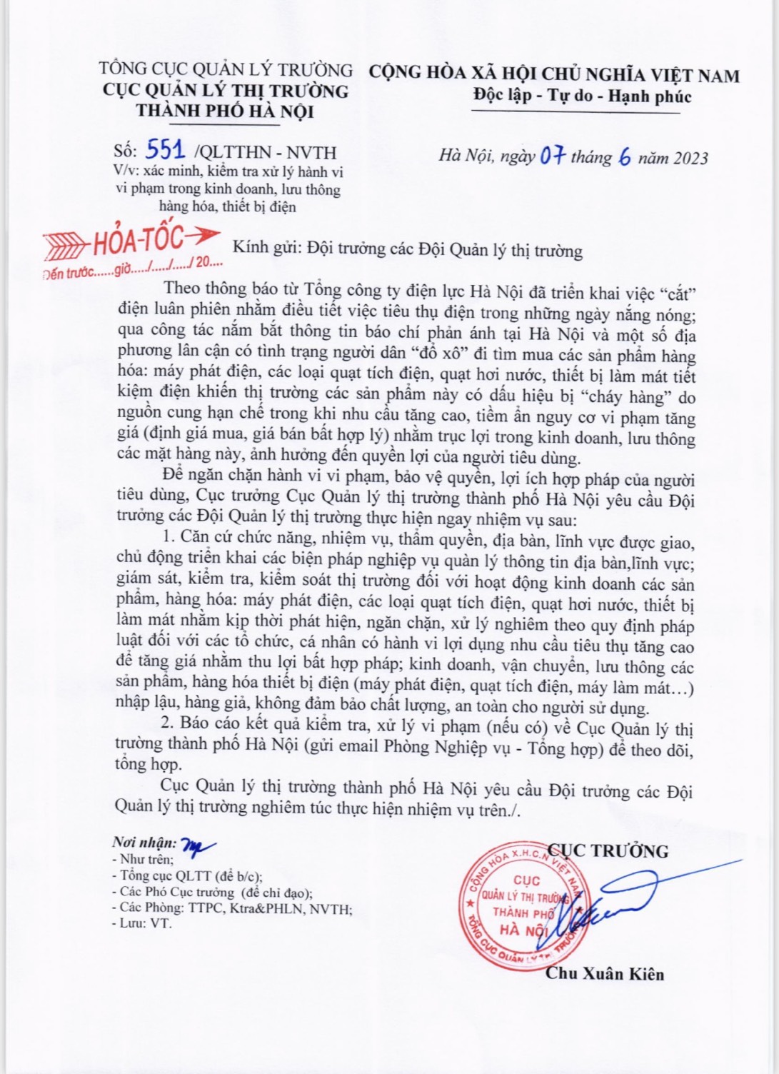 Để ngăn chặn hành vi vi phạm bảo vệ quyền, lợi ích hợp pháp của người tiêu dùng, Cục trưởng cục Quản lý thị trường thành phố Hà Nội vừa ban hành Công văn hỏa tốc số 551/QLTTHN-NVTH yêu cầu Đội trưởng các Đội Quản lý thị trường căn cứ chức năng nhiệm vụ thẩm quyền địa bàn lĩnh vực được giao chủ động triển khai các biện pháp nghiệp vụ quản lý thông tin địa bàn, lĩnh vực; giám sát kiểm tra kiểm soát thị trường đối với hoạt động kinh doanh các sản phẩm, hàng hóa như máy phát điện, các loại quạt tích điện, quạt hơi nước thiết bị làm mát nhằm kịp thời phát hiện, ngăn chặn, xử lý nghiêm cấm theo quy định pháp luật đối với các tổ chức, cá nhân có hành vi lợi dụng nhu cầu tiêu thụ tăng cao để tăng giá nhầm thu lợi bất hợp pháp, kinh doanh vận chuyển lưu thông các sản phẩm, hàng hóa thiết bị điện Nhập lậu, hàng giả không đảm bảo chất lượng an toàn cho người sử dụng.