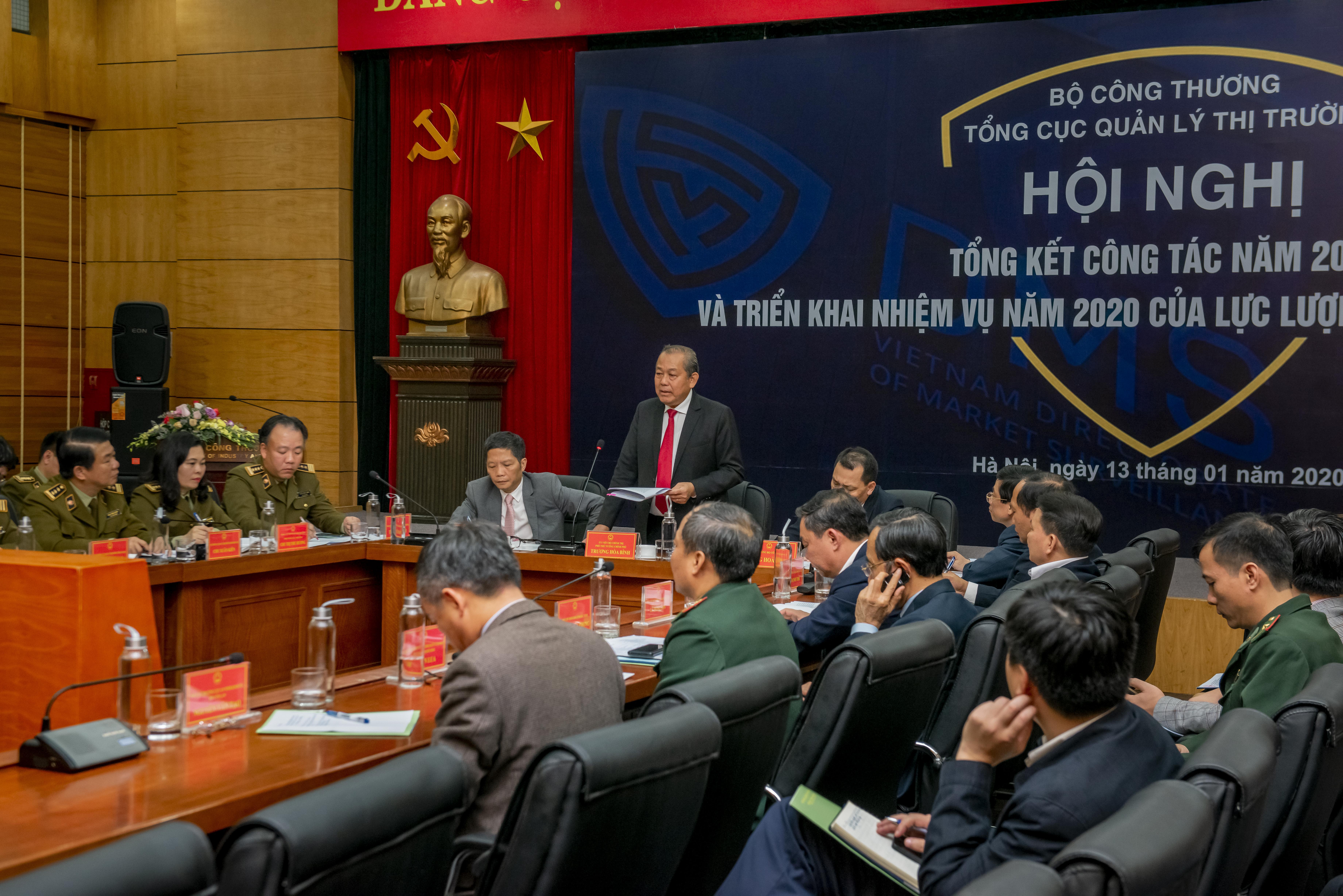 Chiều ngày 13/1, Tổng cục QLTT đã tổ chức Hội nghị Tổng kết công tác năm 2019 và triển khai nhiệm vụ năm 2020. Tham dự Hội nghị có Ủy viên Bộ Chính trị, Phó Thủ tướng thường trực Chính phủ, Trưởng Ban Chỉ đạo 389 quốc gia Trương Hòa Bình; Bộ trưởng Bộ Công Thương Trần Tuấn Anh; Thứ trưởng Bộ Công Thương Đặng Hoàng An; các đơn vị lực lượng chức năng khác như Ban Chỉ đạo 389, Bộ Công An, Bộ đội biên phòng…