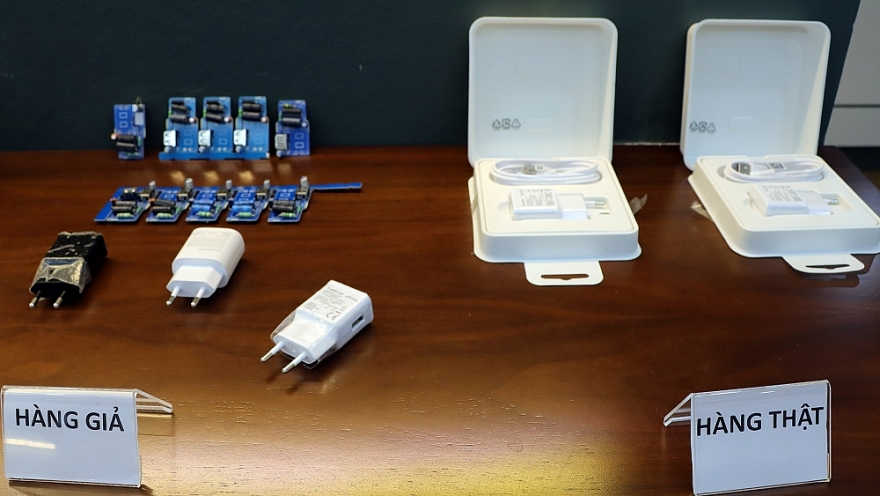 Sạc pin điện thoại Samsung giả, được sản xuất thủ công, thô sơ vừa được Cục QLTT Hà Nội thu giữ