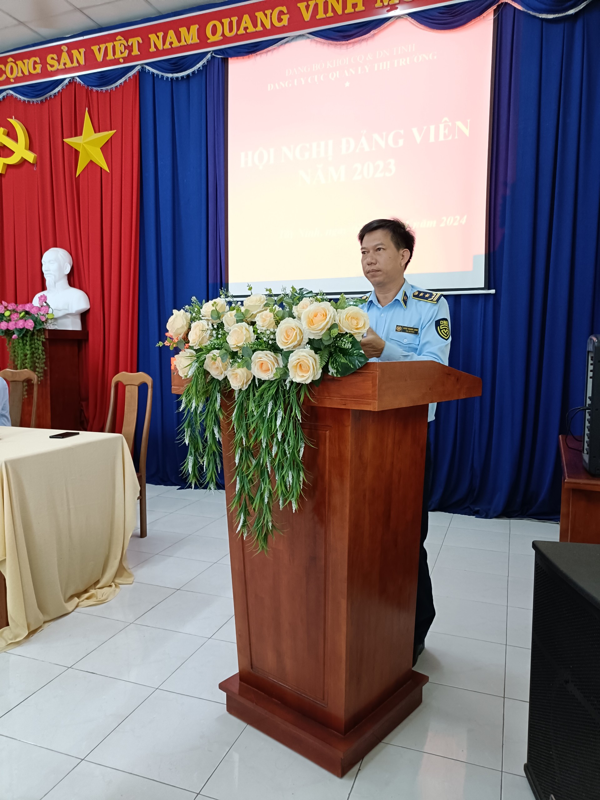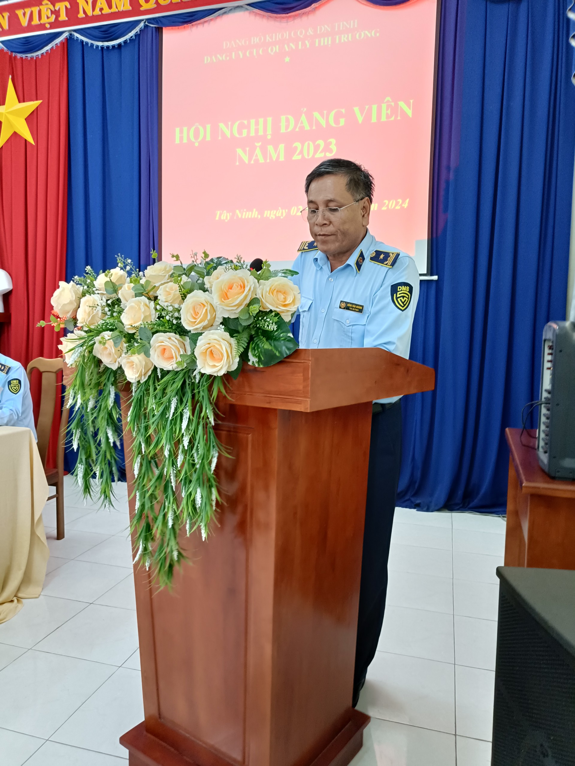 Chiều ngày 02/01/2024, Đảng bộ cơ sở Cục Quản lý thị trường tỉnh Tây Ninh tổ chức Hội nghị đảng viên năm 2023 tại Hội trường Cục Quản lý thị trường tỉnh Tây Ninh nhằm tổng kết công tác xây dựng Đảng năm 2023, triển khai phương hướng, nhiệm vụ, giải pháp năm 2024 gắn với tổng kết công tác kiểm tra, giám sát của Đảng năm 2023, kết quả kiểm điểm, đánh giá, xếp loại chất lượng tổ chức đảng, đảng viên, khen thưởng các tổ chức đảng, đảng viên năm 2023 theo quy định.