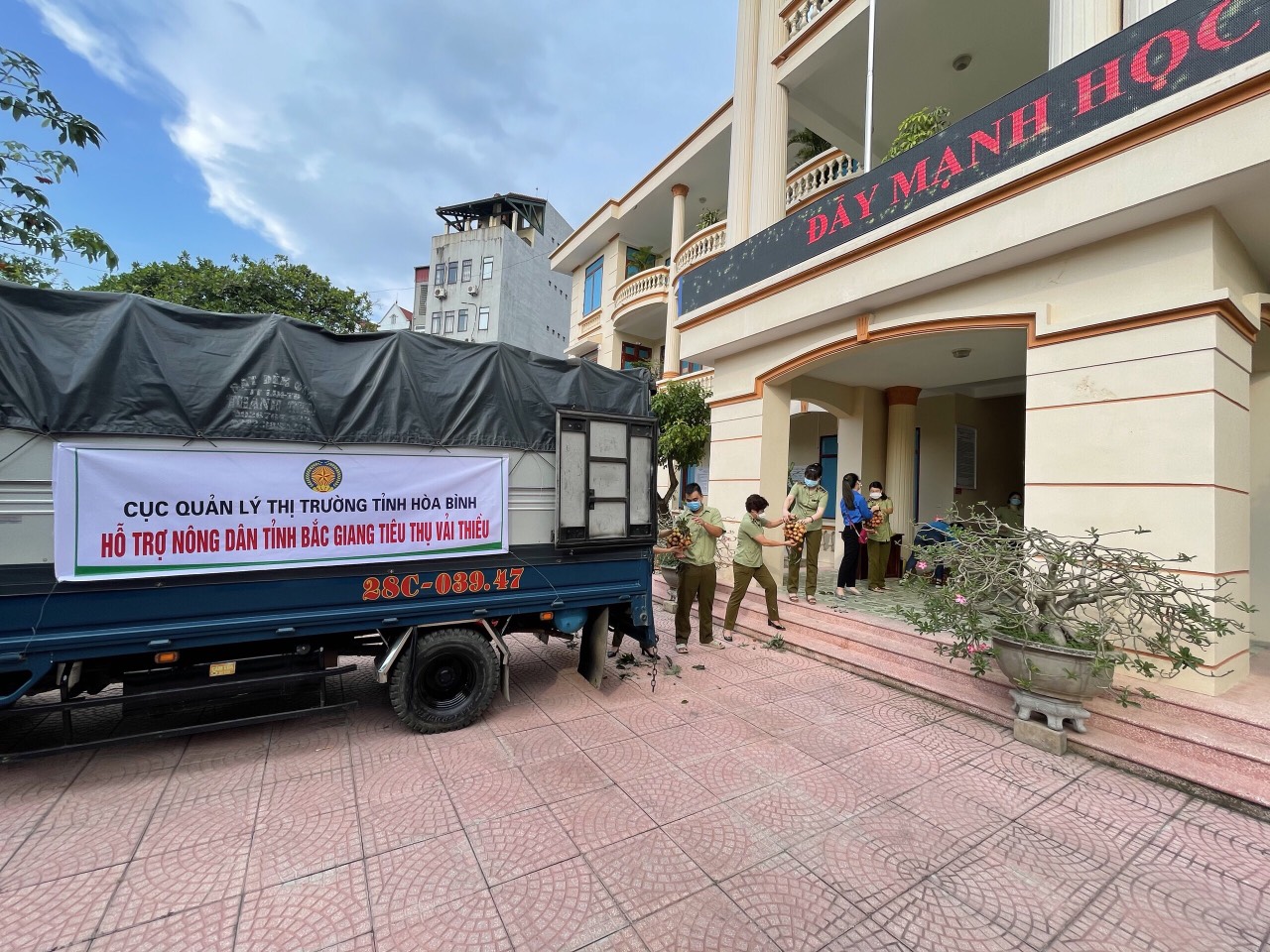 Vải thiều sau khi được nông dân cắt sẽ vận chuyển về trụ sở Cục QLTT Bắc Giang để trung chuyển lên xe của Đội QLTT số 3, Cục QLTT Hòa Bình