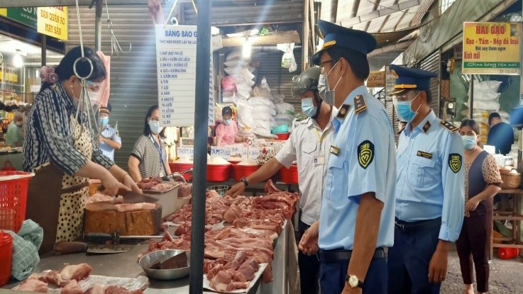 Sáng ngày 04/8/2021, Đội Quản lý thị trường số 3 phối hợp với Đội Quản lý thị trường số 1, Cục QLTT An Giang và Trạm Chăn nuôi & Thú y TP. Long Xuyên tiến hành kiểm tra hoạt động kinh doanh hàng hóa thiết yếu phục vụ nhu cầu tiêu dùng tại các chợ truyền thống, hệ thống cửa hàng Bách Hóa Xanh và VinMart trên địa bàn thành phố Long Xuyên; Đồng thời thực hiện công tác tuyên truyền đến các hộ kinh doanh ý thức hơn trong việc kinh doanh hàng hóa đảm bảo chất lượng, nguồn gốc xuất xứ rõ ràng, thực hiện niêm yết giá và bán đúng giá niêm yết, không bán tăng giá trục lợi, không đầu cơ găm hàng.