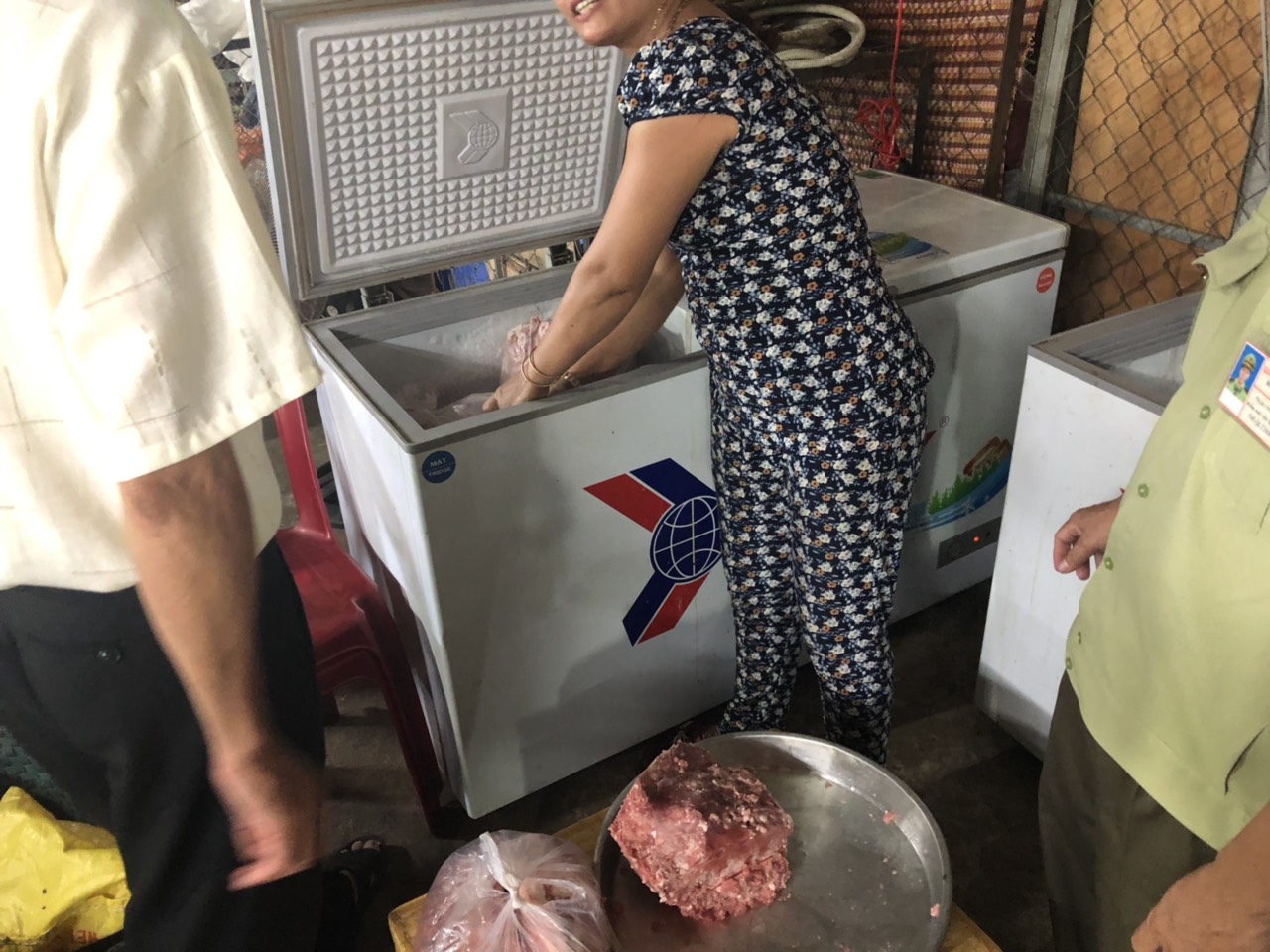 Tại thời điểm kiểm tra, Đoàn kiểm tra phát hiện tại cơ sở đang để tại tủ đông lạnh ngay quầy hàng 124 kg thịt lợn trong tình trạng ôi thiu, biến đổi màu sắc, không đảm bảo vệ sinh thú y, vệ sinh an toàn thực phẩm. Qua làm việc chủ cơ sở không chứng minh được nguồn gốc của số thịt lợn trên, không có tem vệ sinh thú y, không có giấy chứng nhận kiểm dịch theo quy định của pháp luật.