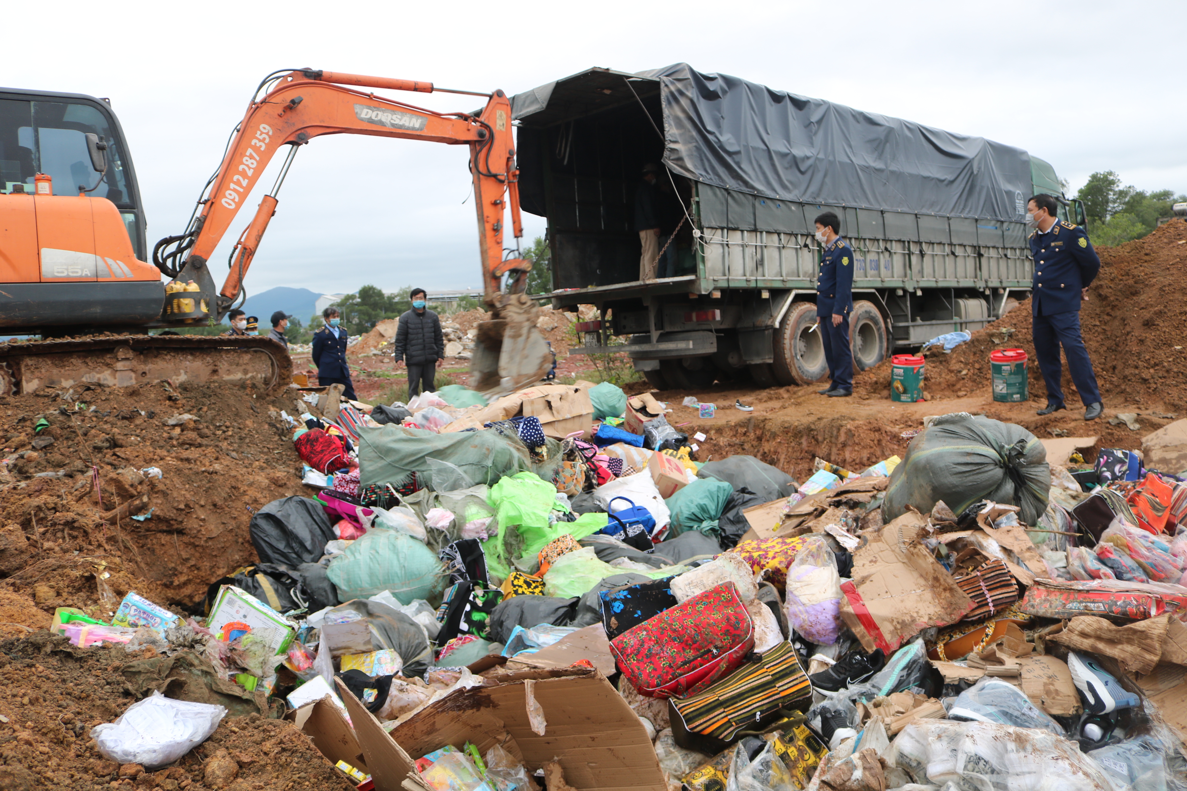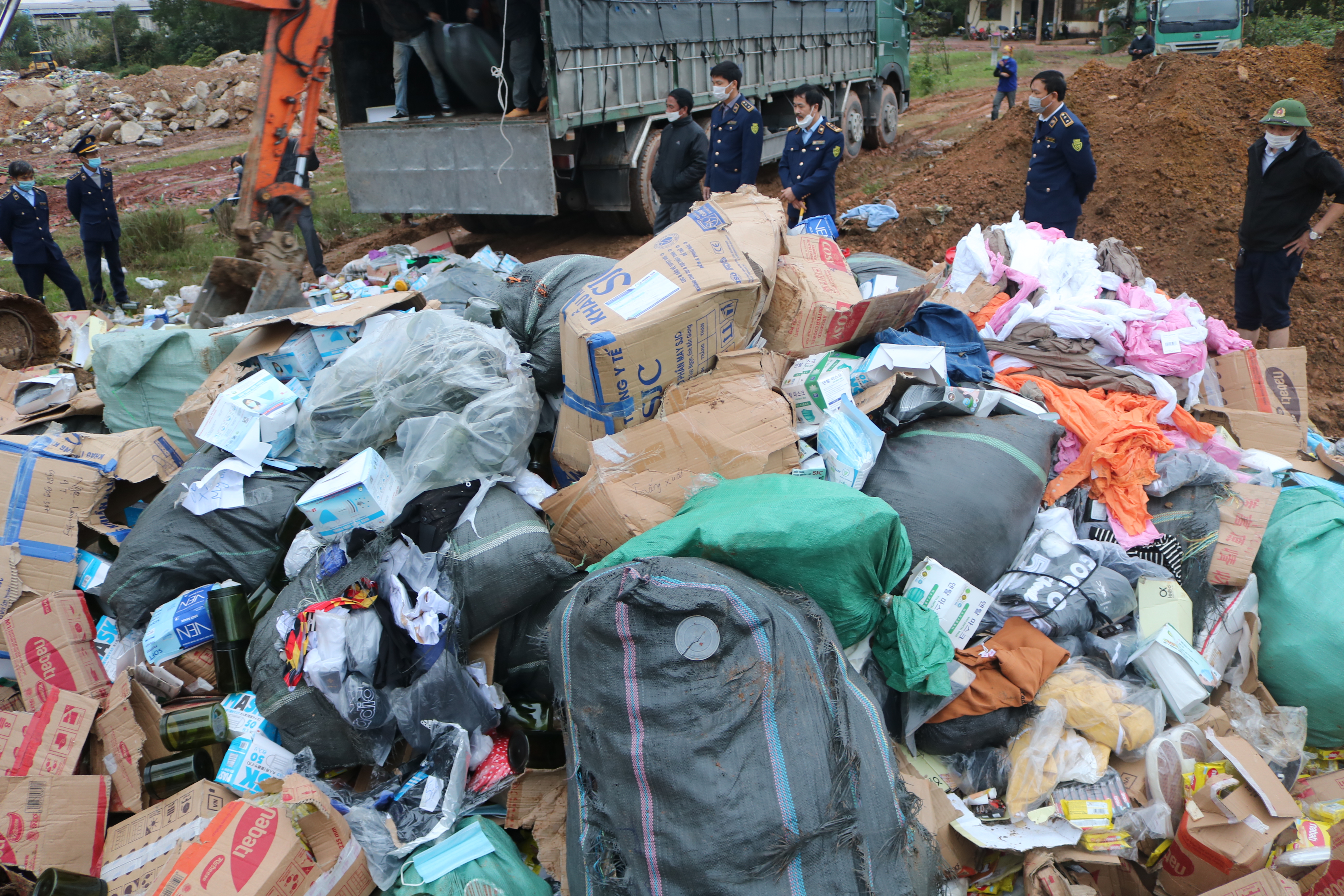 Hội đồng tiêu hủy tài sản đã thống nhất với các phương án tiêu hủy do Cục Quản lý thị trường xây dựng. Cụ thể: đối với đồng hồ giả mạo nhãn hiệu các loại, dùng búa đập vỡ biến dạng làm mất hoàn toàn công dụng vốn có; với hàng hóa là quần áo, giày dép, túi xách, khẩu trang y tế, test sinh phẩm… dùng dầu diezen để đốt cháy; với các tài sản thuộc nhóm thực phẩm cắt bao, đổ xuống hố đào sẵn; với các mặt hàng như đồ chơi trẻ em, hàng gia dụng, thuốc tân dược…dùng xe ủi cán bể mất hết công dụng, sau đó ủi xuống hố đã được đào sẵn.
