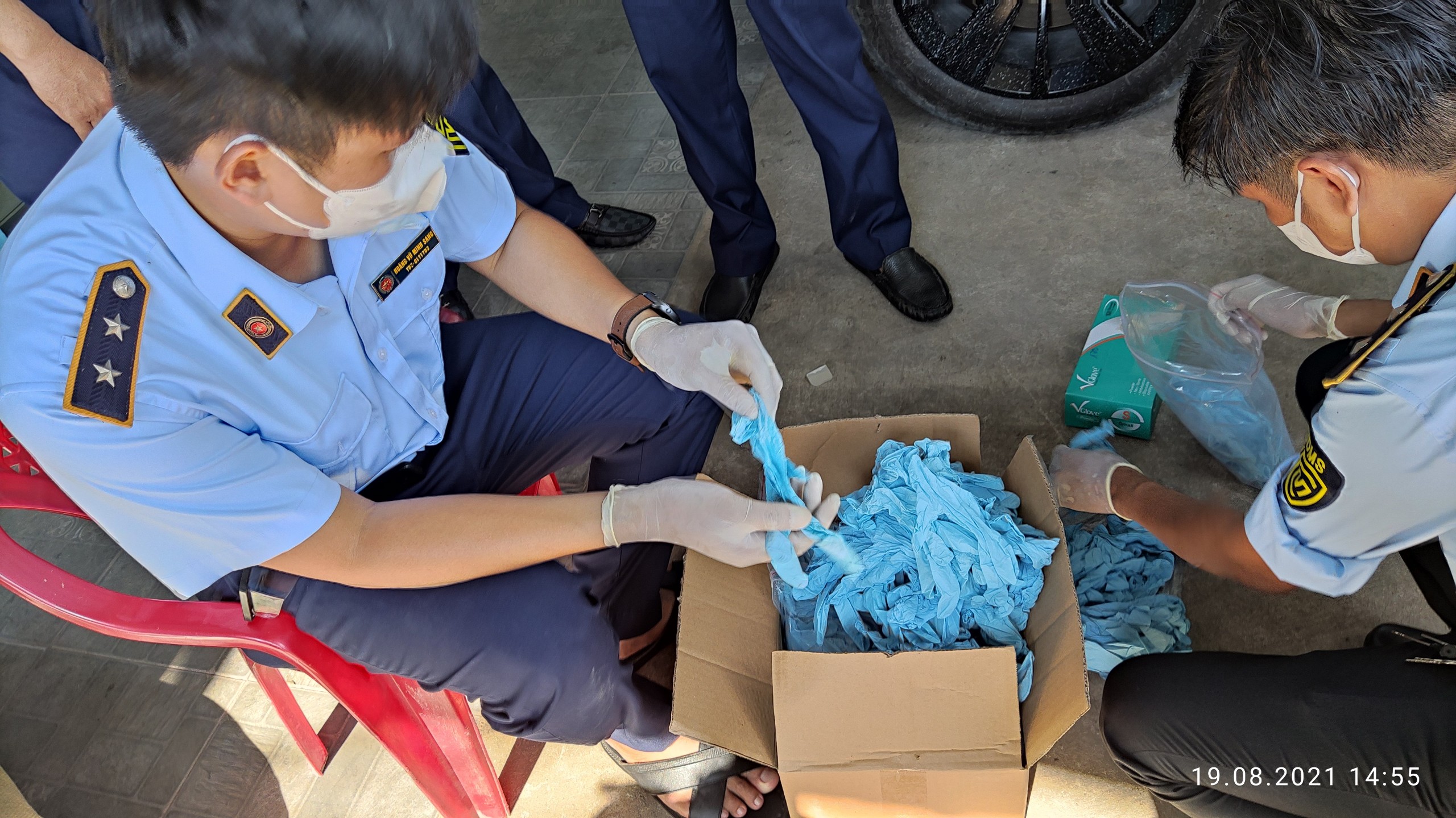 Kiểm tra thực tế chi tiết hàng hóa thuộc sở hữu của ông Nghĩa, lực lượng chức năng ghi nhận 148.000 sản phẩm là đồ bảo hộ, không nhãn hiệu và găng tay cao su không rõ nguồn gốc xuất xứ. Số găng tay được đựng trong các bao bì bằng nylon, không có bất kỳ thông tin thể hiện tên, địa chỉ nhà sản xuất/chịu trách nhiệm về hàng hóa. Đặc biệt, số găng tay có dấu hiệu đã qua sử dụng.