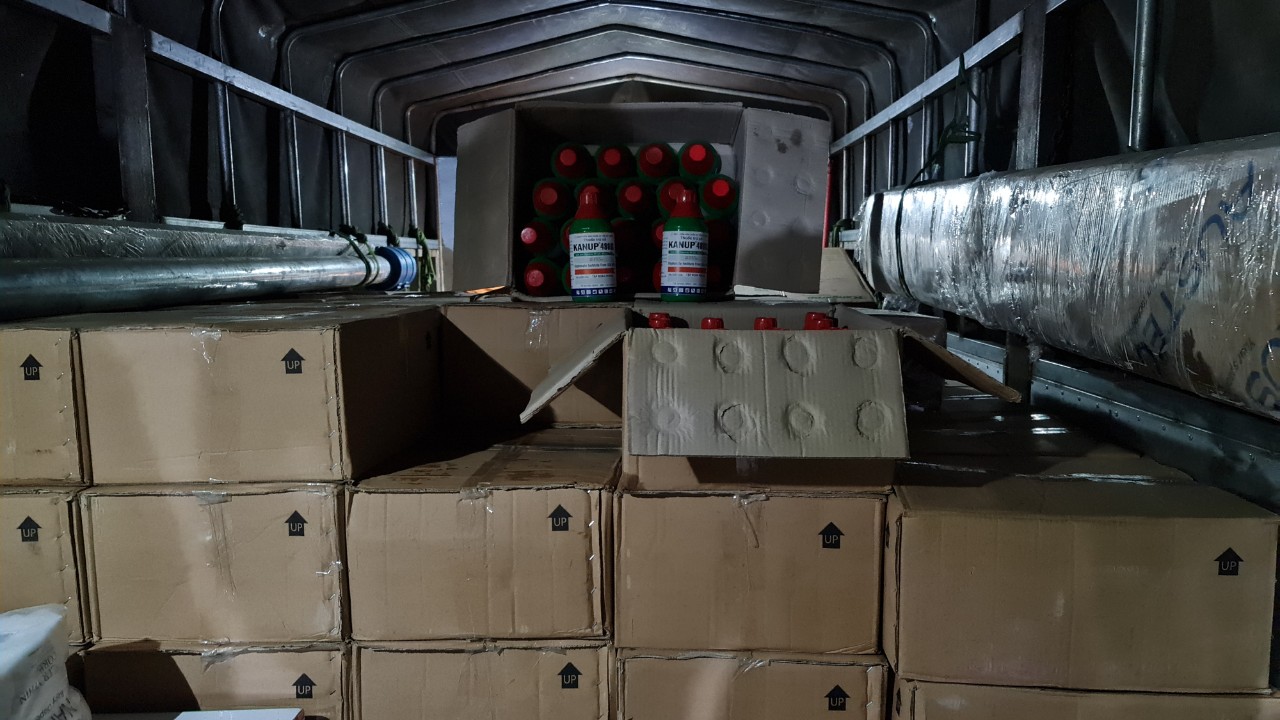 Qua kiểm tra Đoàn kiểm tra phát hiện trên xe có vận chuyển 100 thùng Cacton bên ngoài không ghi nhãn, nhưng bên trong có chứa thuốc trừ cỏ nhãn hiệu KANUP 480 SL; số lot: 0034/VT; ngày sản xuất 01/06/2019; thể tích 900ml/chai; số đăng ký 1793/CNKT-BVTV; đơn vị sang chai và phân phối: CN Việt Thắng tại Long An, lô số M84, KCN Đức Hòa 1, Đức Hòa, tỉnh Long An. Trong thành phần ghi trên nhãn có chứa hoạt chất Glyphosate IPA Salt. Mỗi thùng chứa 20 chai, mỗi chai khối lượng 900ml. Sau khi kiểm đếm tổng số lượng là 2.000 chai với tổng khối lượng là 1.800 lít.