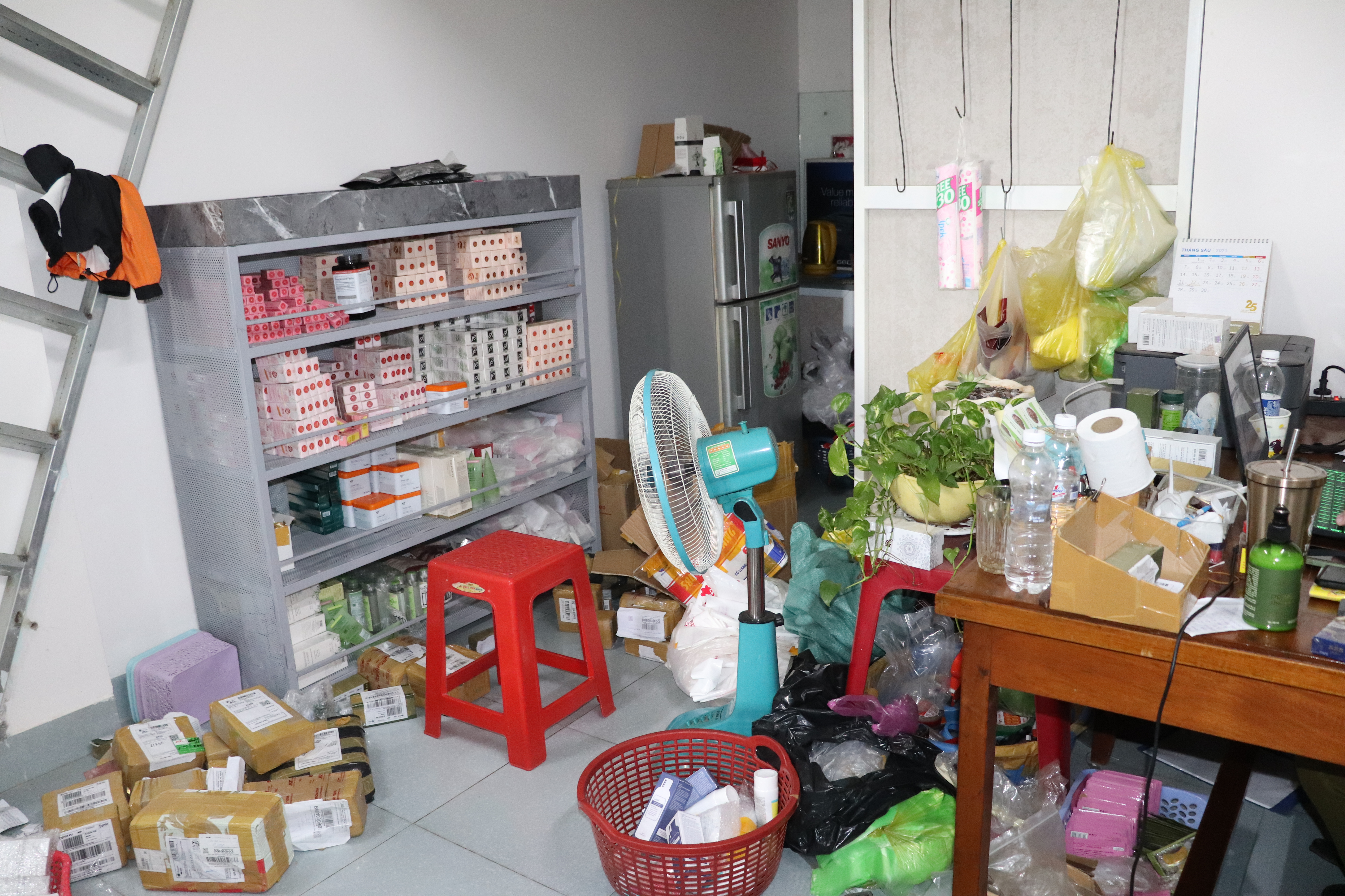 Qua kiểm tra, bước đầu Đoàn kiểm tra phát hiện tại địa chỉ nêu trên chứa hàng nghìn sản phẩm thực phẩm chức năng (thuốc giảm cân; siro hỗ trợ ăn ngon, ngủ ngon cho trẻ em; viên tinh nghệ sữa ong chúa; collagen; bột cần tây…); mỹ phẩm (kem dưỡng da, sữa tắm, tinh dầu, thuốc nhuộm tóc, dầu gội đầu, son môi…); bánh kẹo, ca cao…