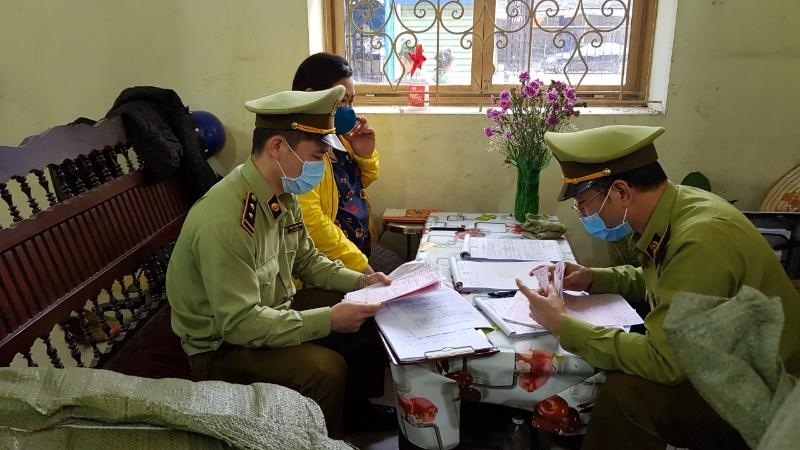 Công chức Đội QLTT số 7 tiến hành kiểm tra, lập biên bản, Ảnh: ĐVCC