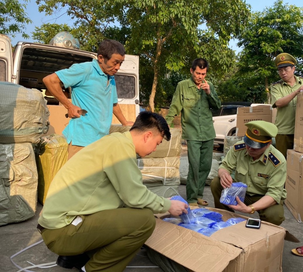 Tiến hành kiểm tra, Đoàn công tác phát hiện trên phương tiện đang vận chuyển các loại hàng hóa thuộc nhóm hàng gia dụng do Trung Quốc sản xuất bao gồm: Tăng đơ cắt tóc; Bút bi kim; Chậu gội đầu bằng nhựa; Đèn xông tinh dầu; Ví nữ giả da cầm tay; Hộp đựng đồ bằng vải; Kệ nhựa đựng đồ rửa bát; Túi ngủ văn phòng; Massa cầm tay; Móc kẹp treo quần áo…. Tổng số hàng hóa trên lên đến trên 10.000 đơn vị sản phẩm.