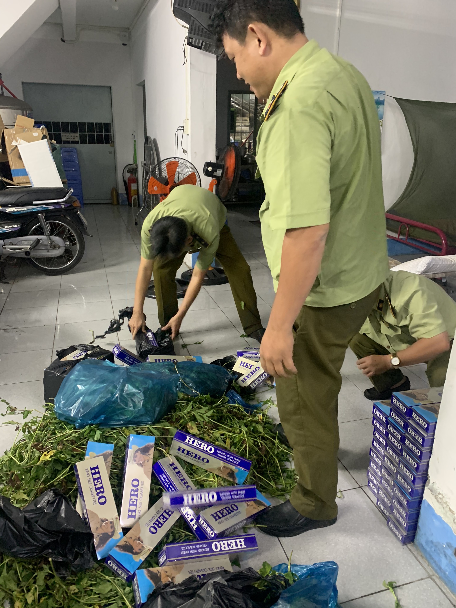 Thủ đoạn của các đối tượng vận chuyển hàng cấm là dùng xe máy chở theo các giỏ nhựa, phía trên phủ rau xanh để giấu thuốc lá bên dưới. Khi bị phát hiện thì các đối tượng nhanh chóng bỏ xe để tẩu thoát.