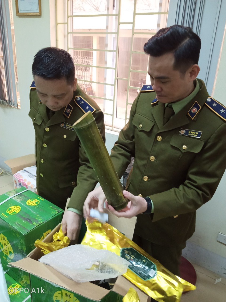 Vào hồi 06h30’ ngày 07/01/2021, Đội QLTT số 5 phối hợp với Phòng Cảnh sát kinh tế (PC03)- Công an tỉnh Lào Cai kiểm tra, phát hiện lô hàng đóng trong 40 hộp cat tông đang tập kết tại khu vực đường Hợp Thành, phường Lào Cai, thành phố Lào Cai. Kết quả khám bên trong các hộp cat tông có chứa Rượu ống tre do nước ngoài sản xuất, số lượng 320 ống (08 ống/hộp). Toàn bộ hàng hóa không có giấy tờ kèm theo.