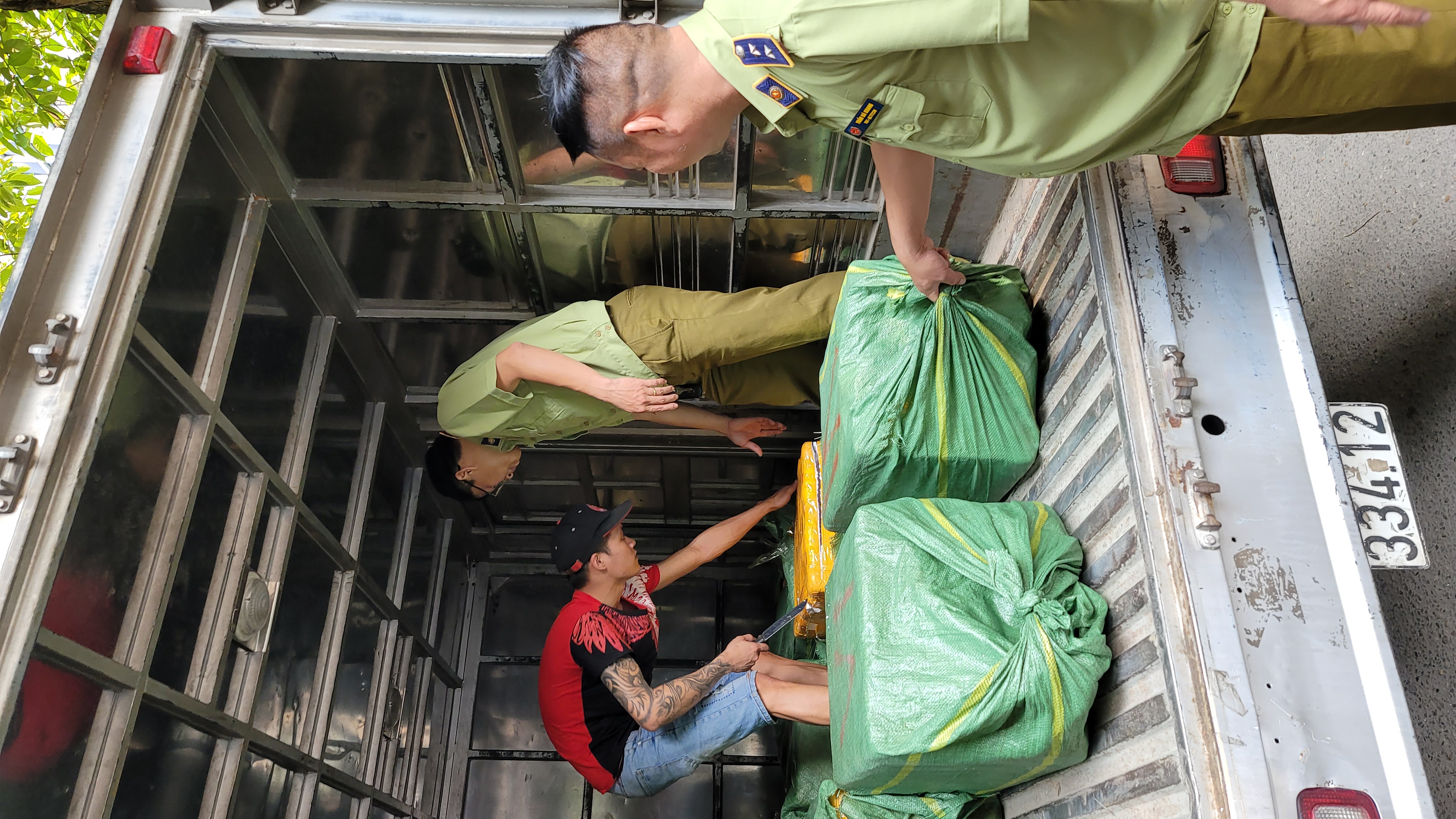 Tăng cường công tác kiểm tra, kiểm soát trong tháng ATTP năm 2021, ngày 7/4/2021, Đội QLTT số 5 thuộc Cục QLTT thành phố Hà Nội tiến hành khám phương tiện vận tải có biện kiểm soát 29H-334.12 đang dừng đỗ trước số K1-838 Bạch Đằng, quận Hai Bà Trưng, Hà Nội.