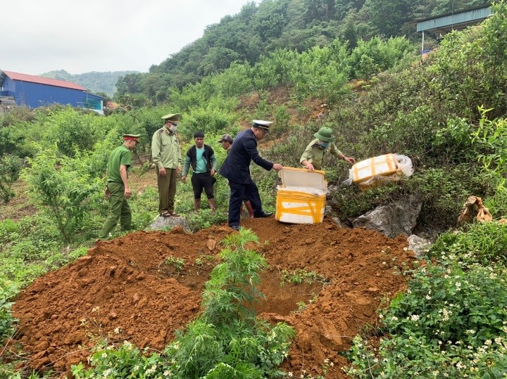 Đội QLTT số 3 - Cục QLTT Sơn La phối hợp với Trạm kiểm dịch Lóng Luông và Công an huyện Vân Hồ kiểm tra, xử lý đối tượng vận chuyển nội tạng, da trâu, bò không rõ nguồn gốc, bốc mùi hôi thối và đang trong quá trình phân hủy.