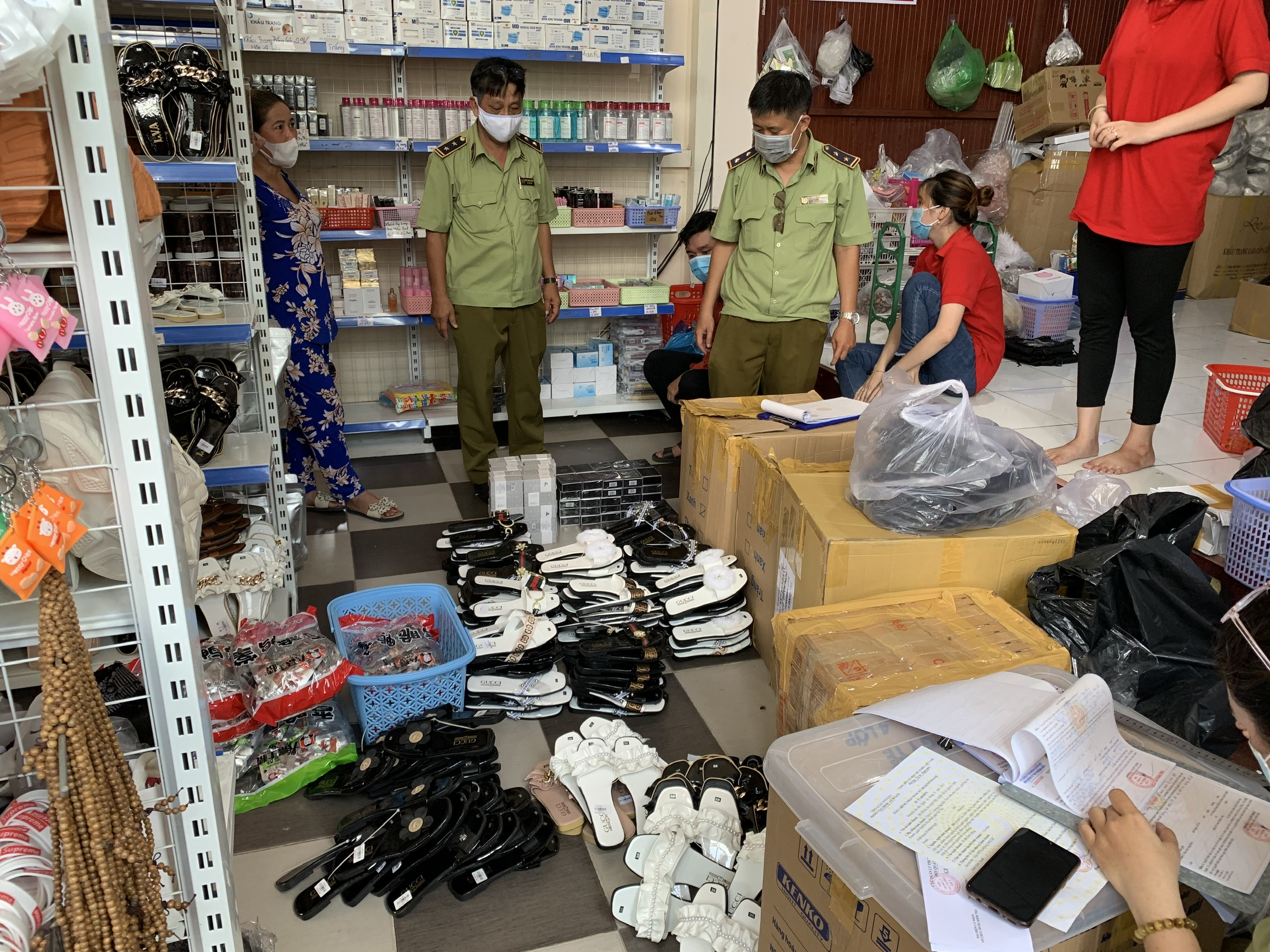 Tại thời điểm kiểm tra, chủ hộ kinh doanh là ông N.H.P không xuất trình được hóa đơn, chứng từ liên quan đến hàng hóa. Tại đây, Đoàn kiểm tra ghi nhận tại cơ sở kinh doanh có bày bán trên 500 sản phẩm bao gồm dép nữ giả mạo nhãn hiệu Gucci; nước hoa hiệu Blue de Flower; ShiMang lvà hàng trăm gói thực phẩm chân vịt cay hiệu DaCheng. Tất cả đều không rõ nguồn gốc xuất xứ.
